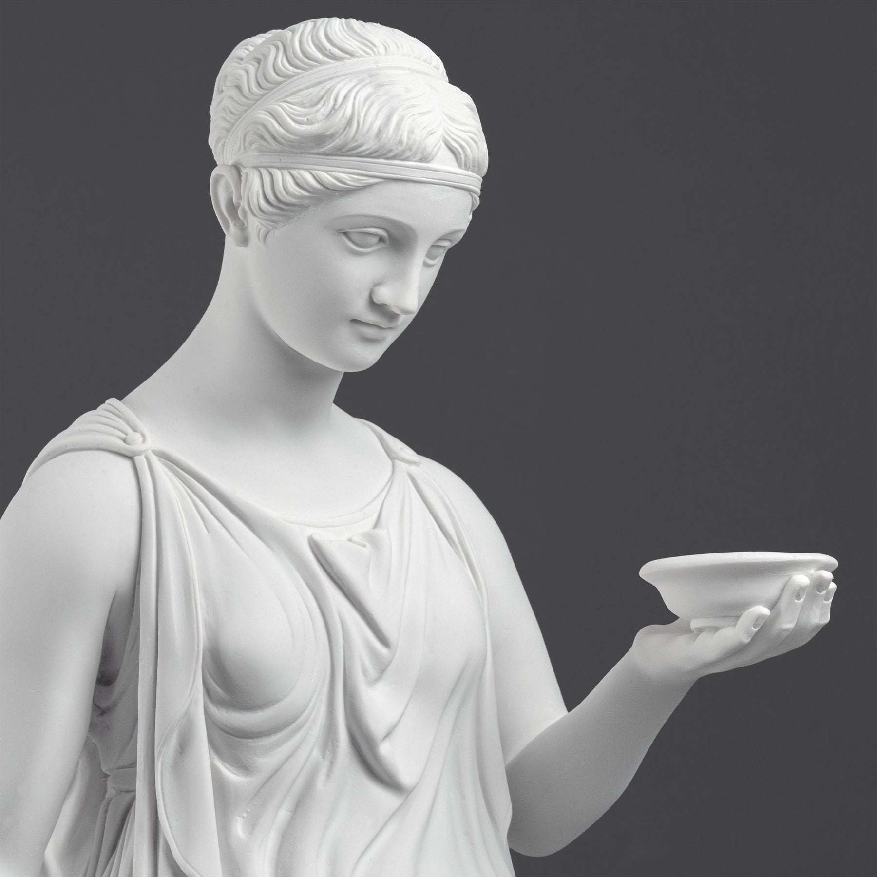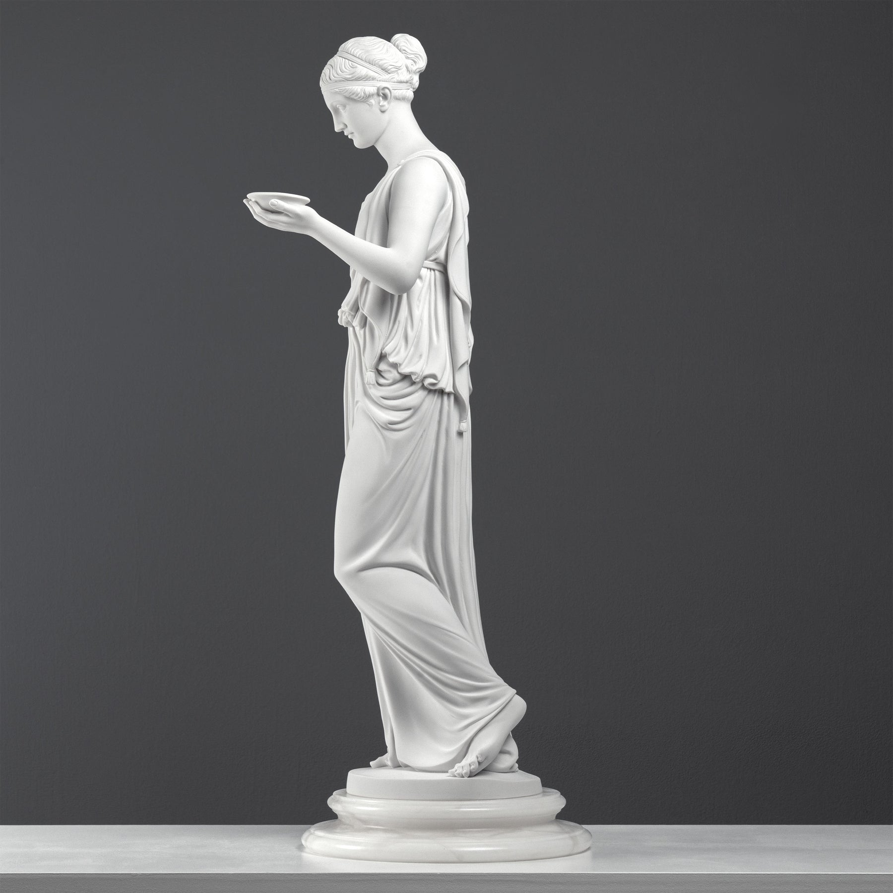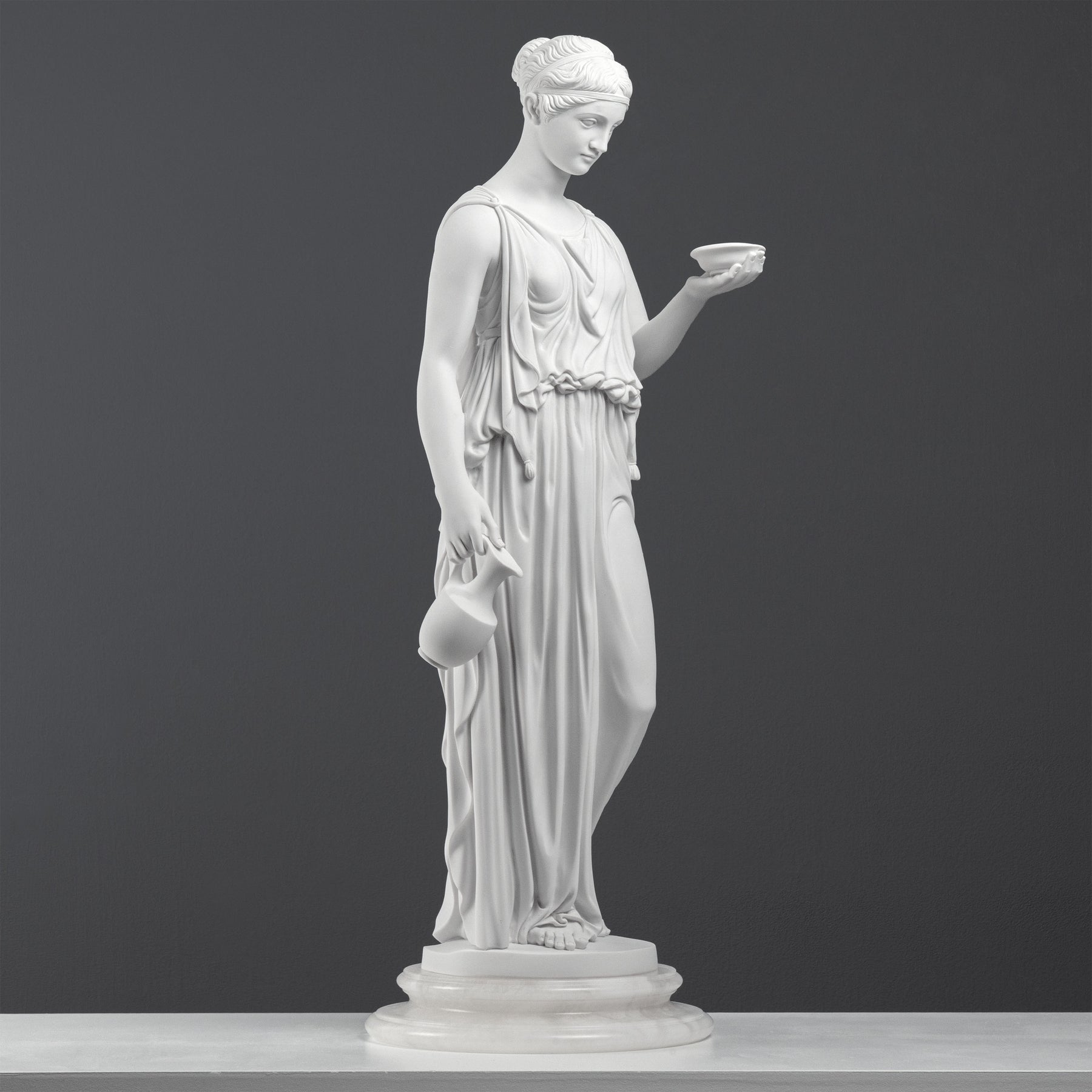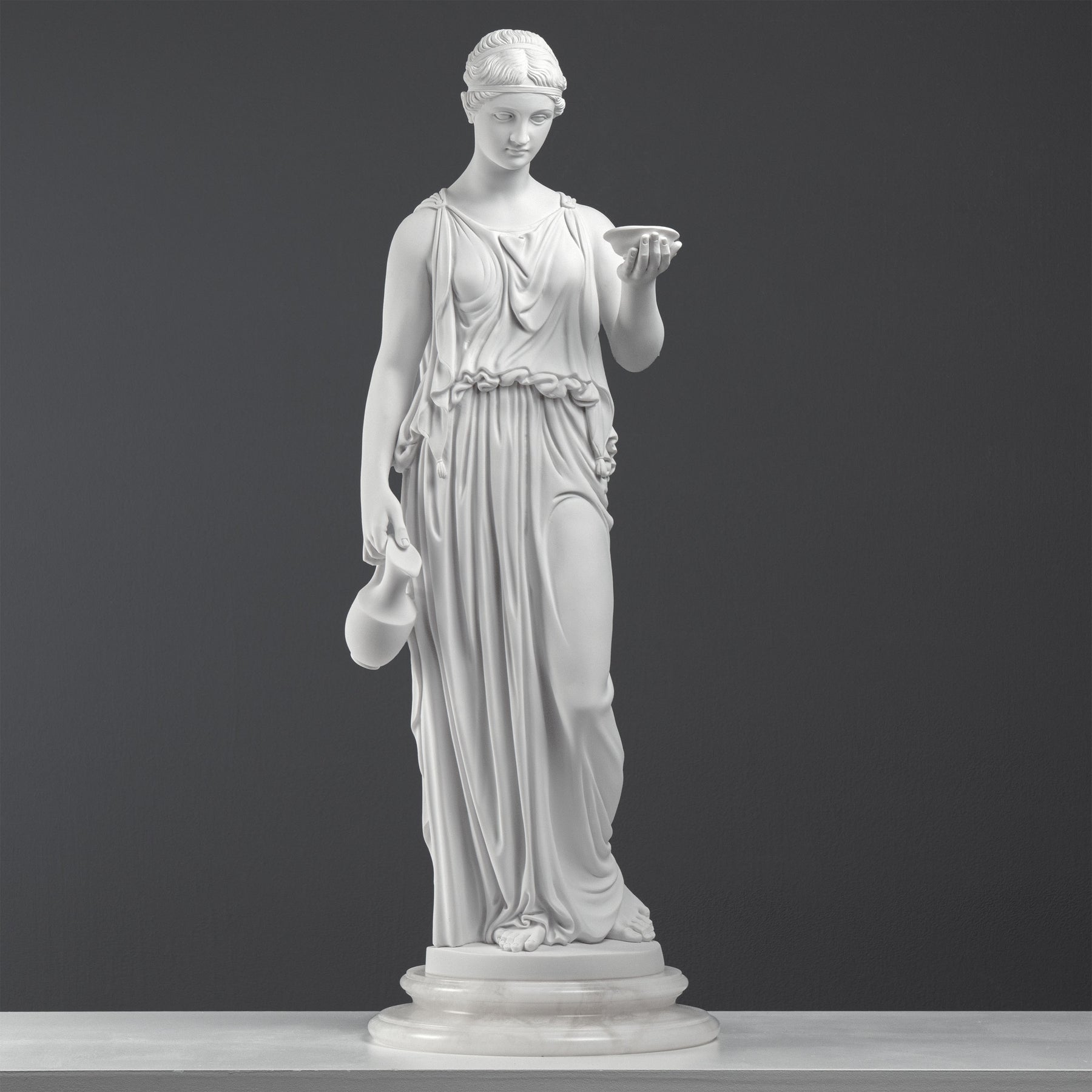 • This refined sculpture is inspired by the celebrated neoclassical interpretation of Hebe, the Greek goddess of eternal youth and divine cupbearer to the Olympian gods, as envisioned by the great Danish sculptor Bertel Thorvaldsen.
