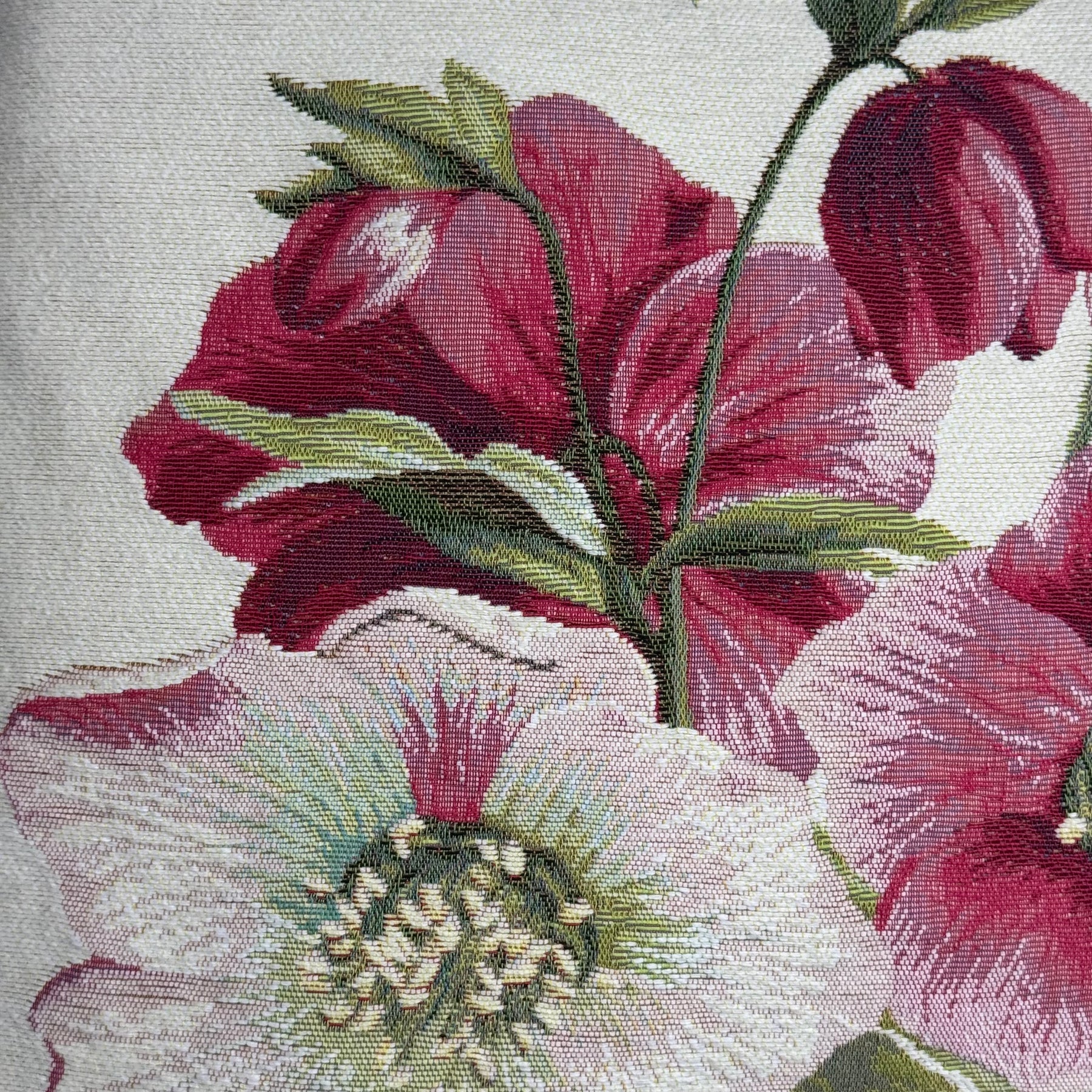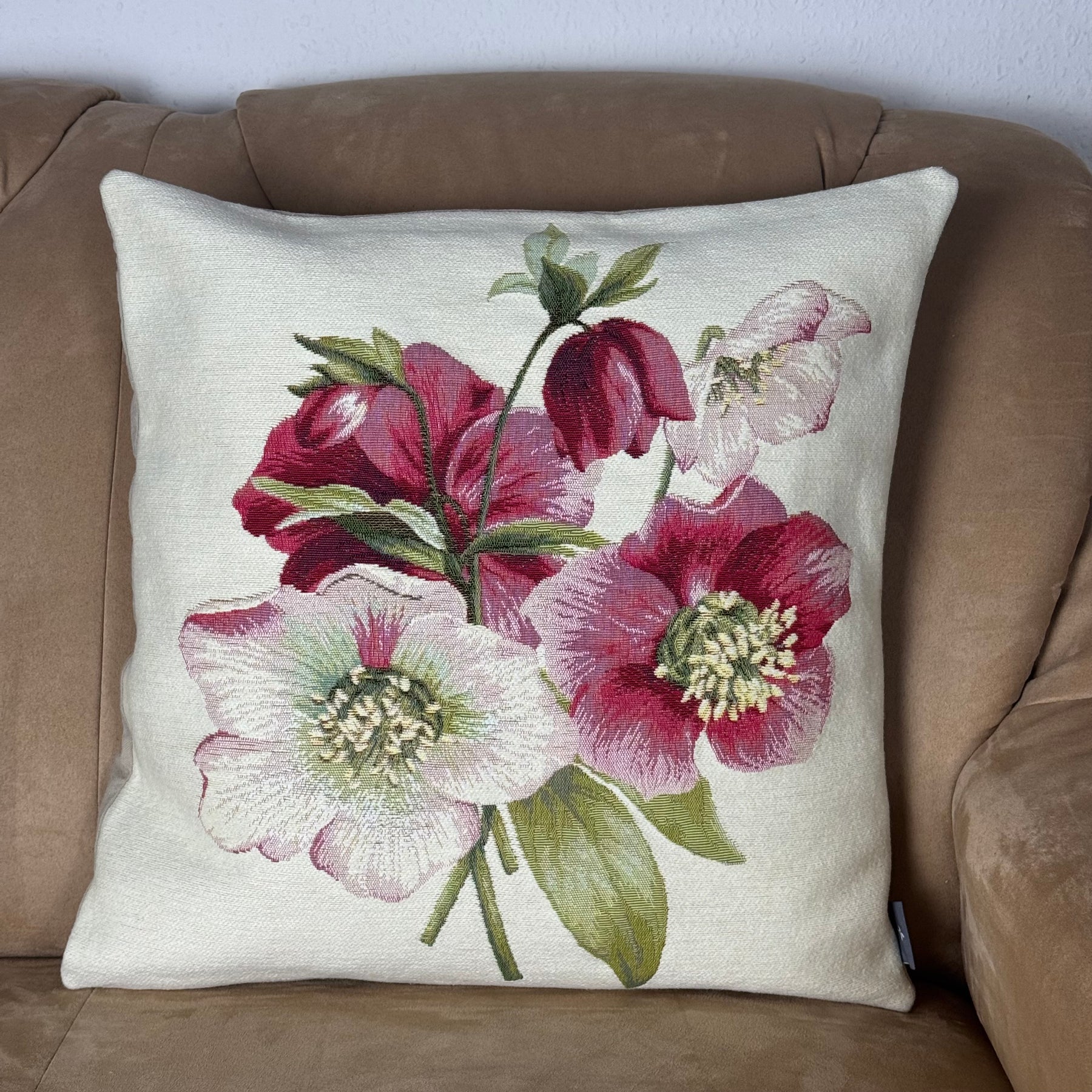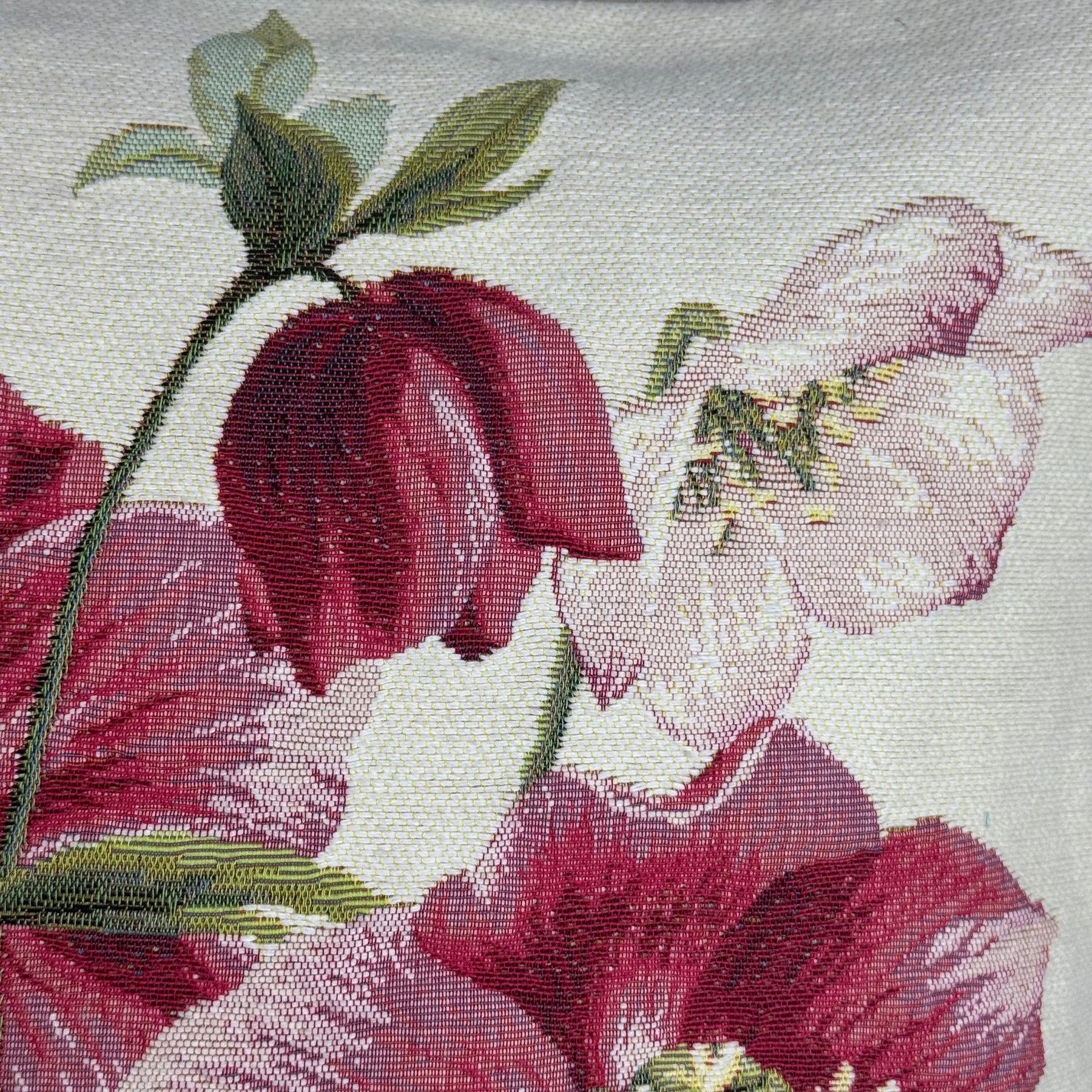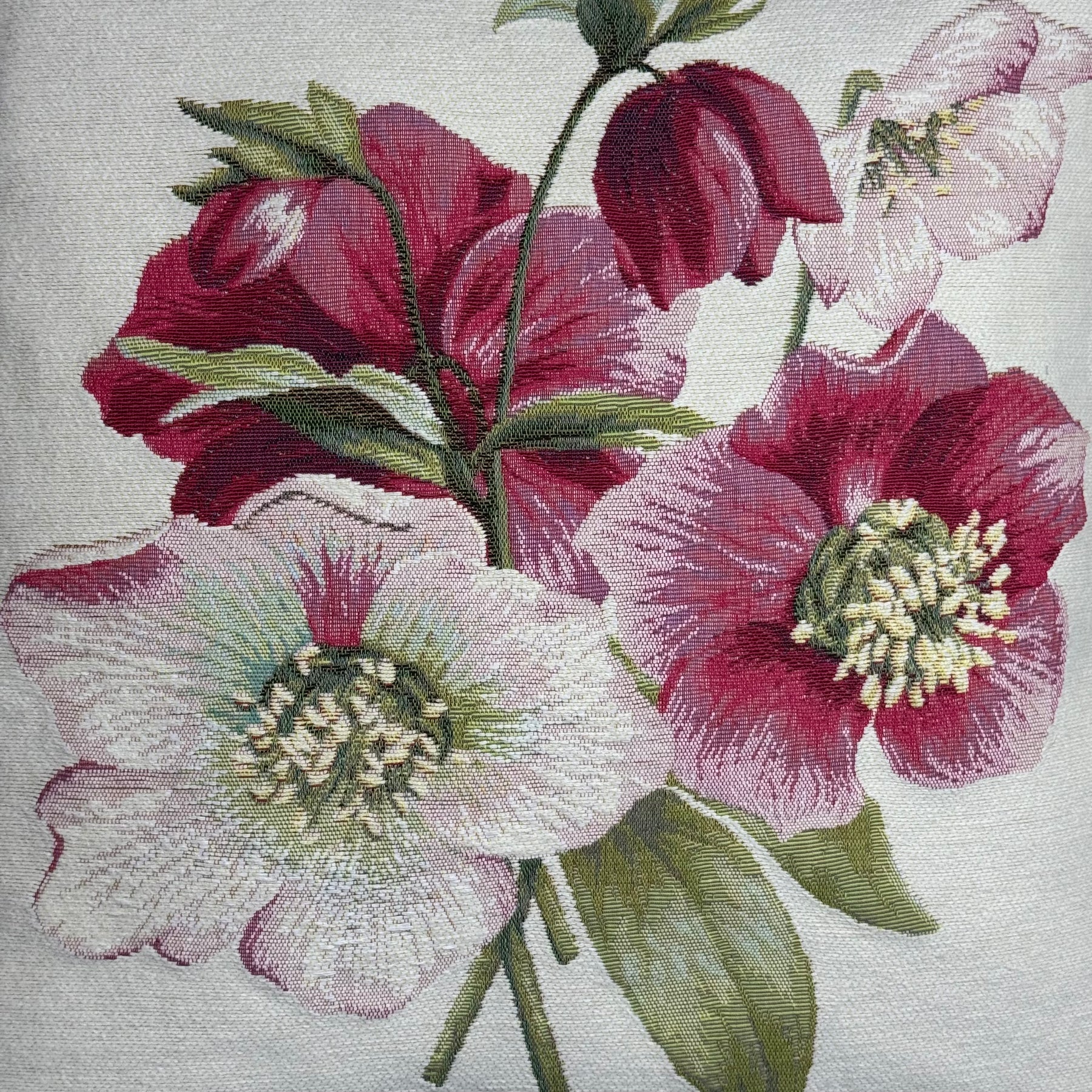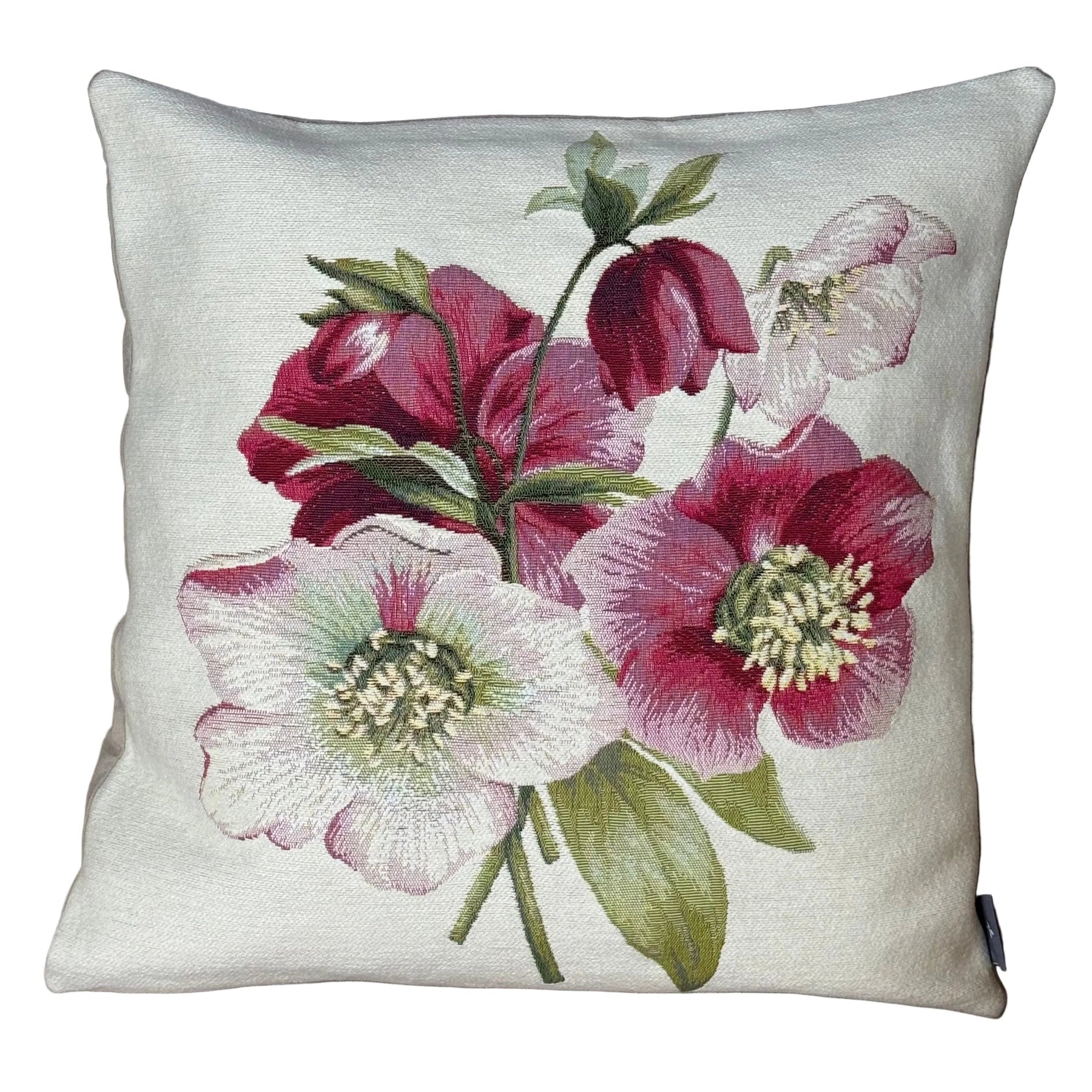 White Pillow Cover with Red Flowers, Christmas Rose (Jacquard Woven)